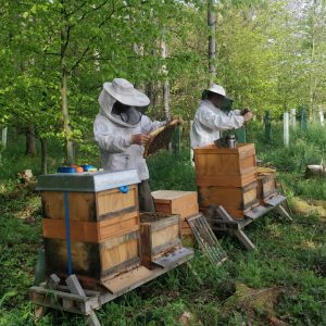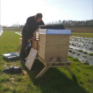 Für unser Gemüse sind Bienen als Bestäuber uninteressant. Das meiste erntet man vor der Blüte. Aber unsere Erdbeeren brauchen die Bienen. Deswegen haben wir 2022 zwei Völker neben unserem Solawi-Erdbeerfeld aufgestellt. Aus den ursprünglich zwei Beuten (Bienenkästen) sind mittlerweile 20 Völker geworden, aufgestellt an drei Standorten in Kaufering, Geretshausen und im Westerholz.